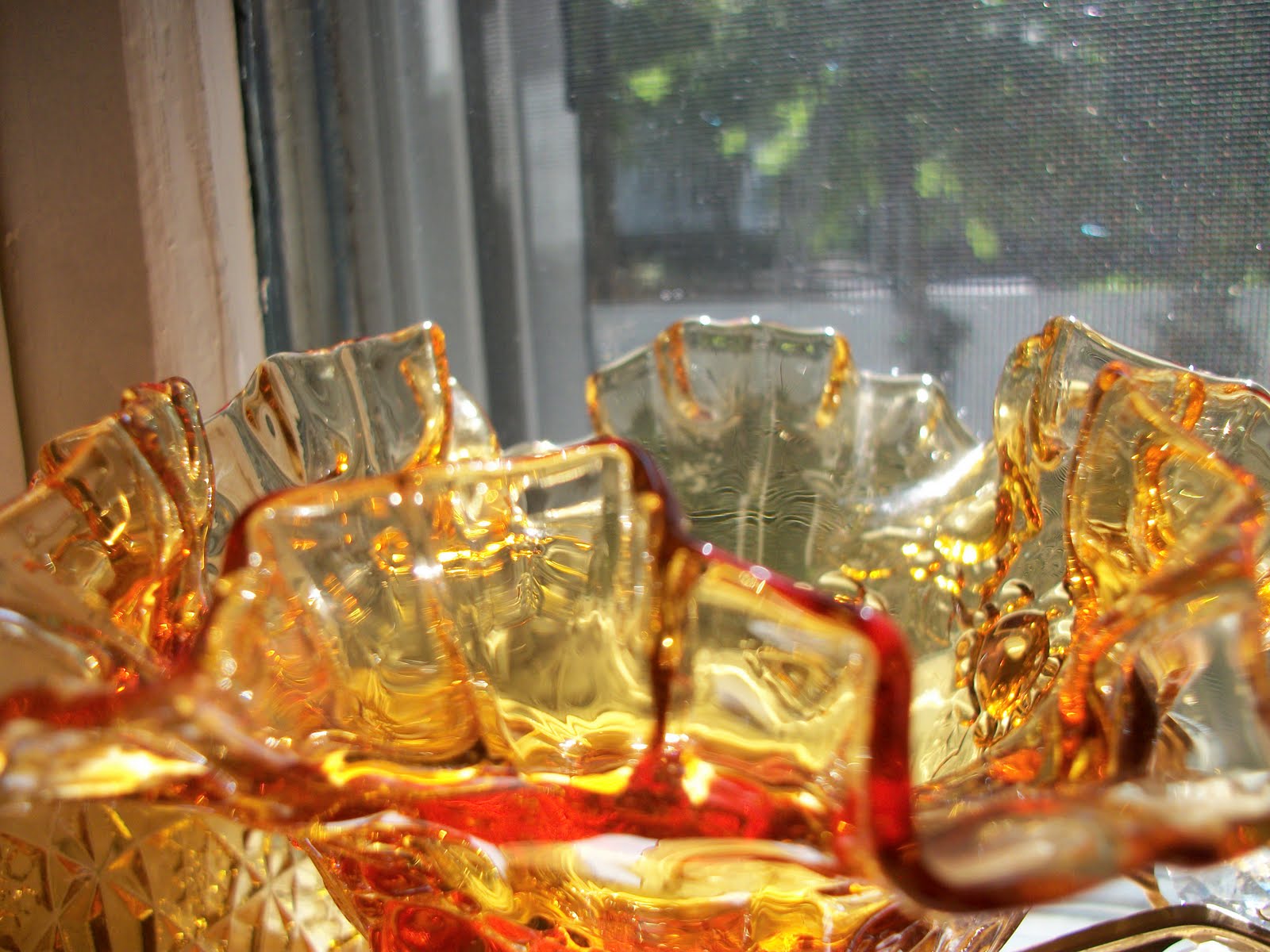 Well, come fall, my dear friend always decorates with amber colored glass. This was never a favorite of mine but now I love it. It reminds me of molten gold, rich and brilliant in the sun.